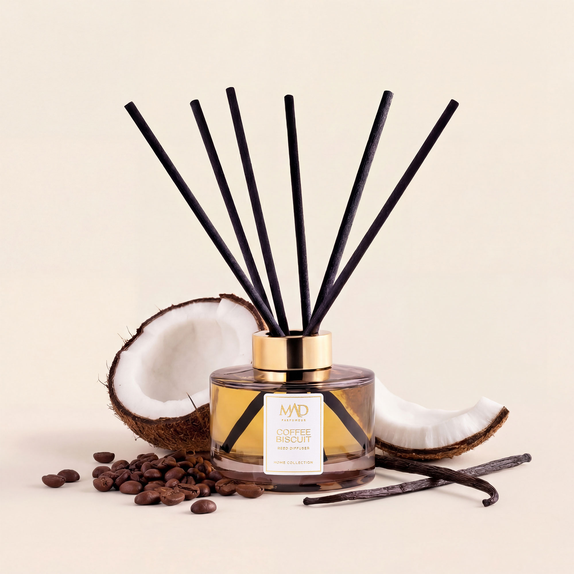 MAD Coffee Biscuit носи топла атмосфера и пријатни спомени во вашите простории со уникатната хармонија на кафе и кокос. Овој уникатен мирис, со своите слатки и потпечени ноти, буди чувство на свежо испечено задоволство, придружувајќи ги мирните моменти што ги поминувате со вашите најблиски.