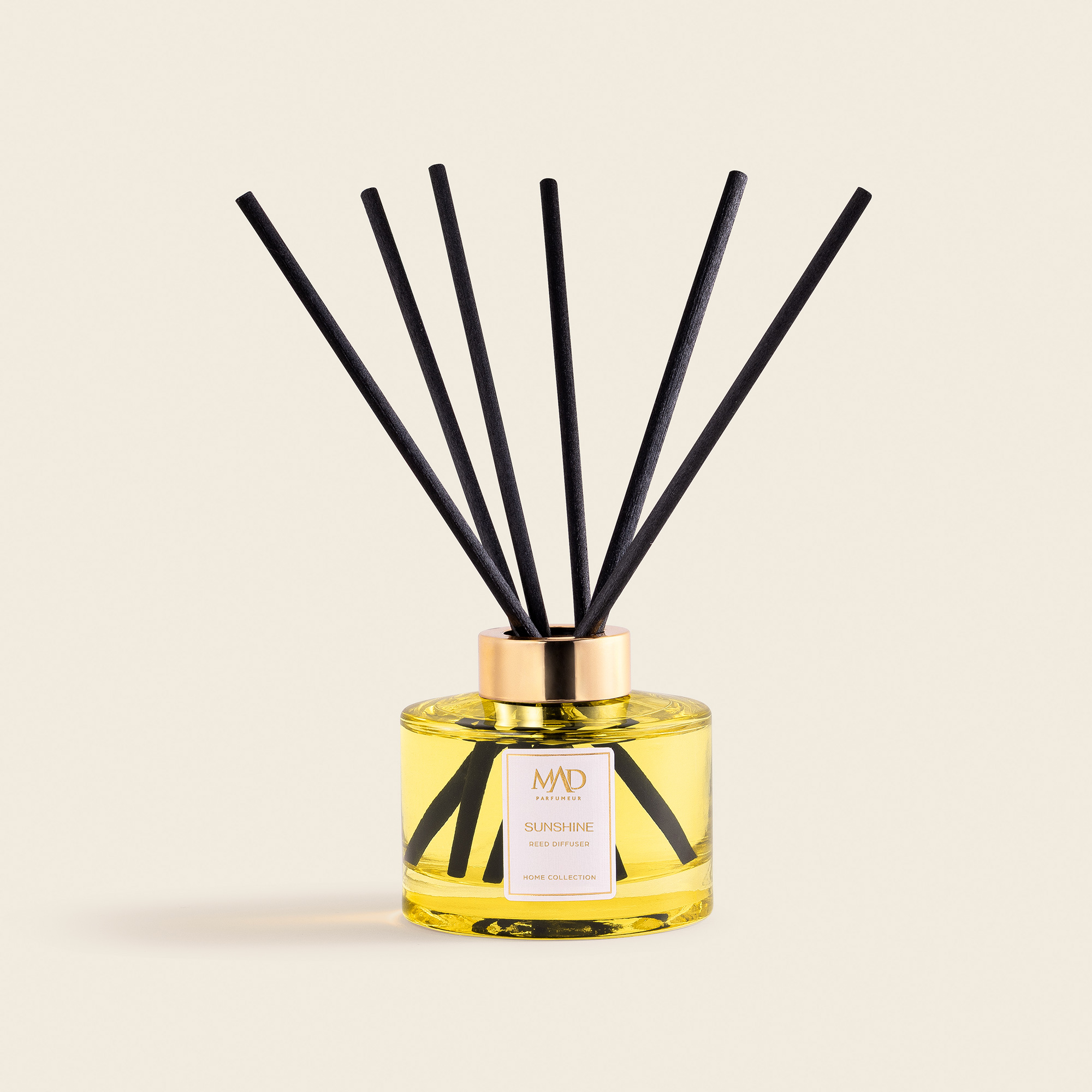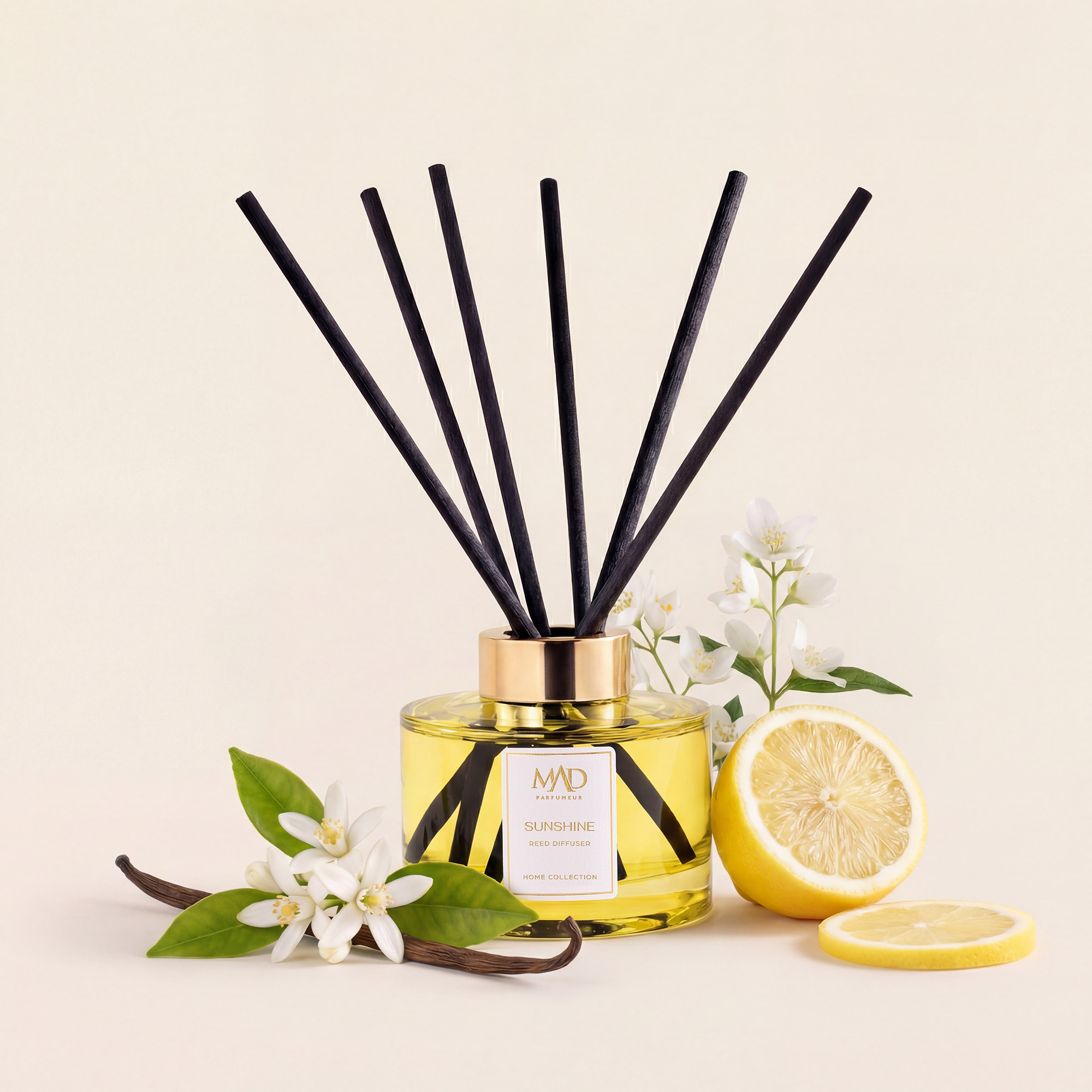 MAD Sunshine е создаден да донесе свежина и среќа во вашите простории, исто како сончевата светлина по која е именуван. Освежителните ноти на лимон и портокал што ги чувствувате на почетокот ќе ви дадат освежителен почеток на денот. Топлите ноти на јасмин и ванила, придружени со сладок поветар, ја носат магијата на мирните моменти во вашиот дом.